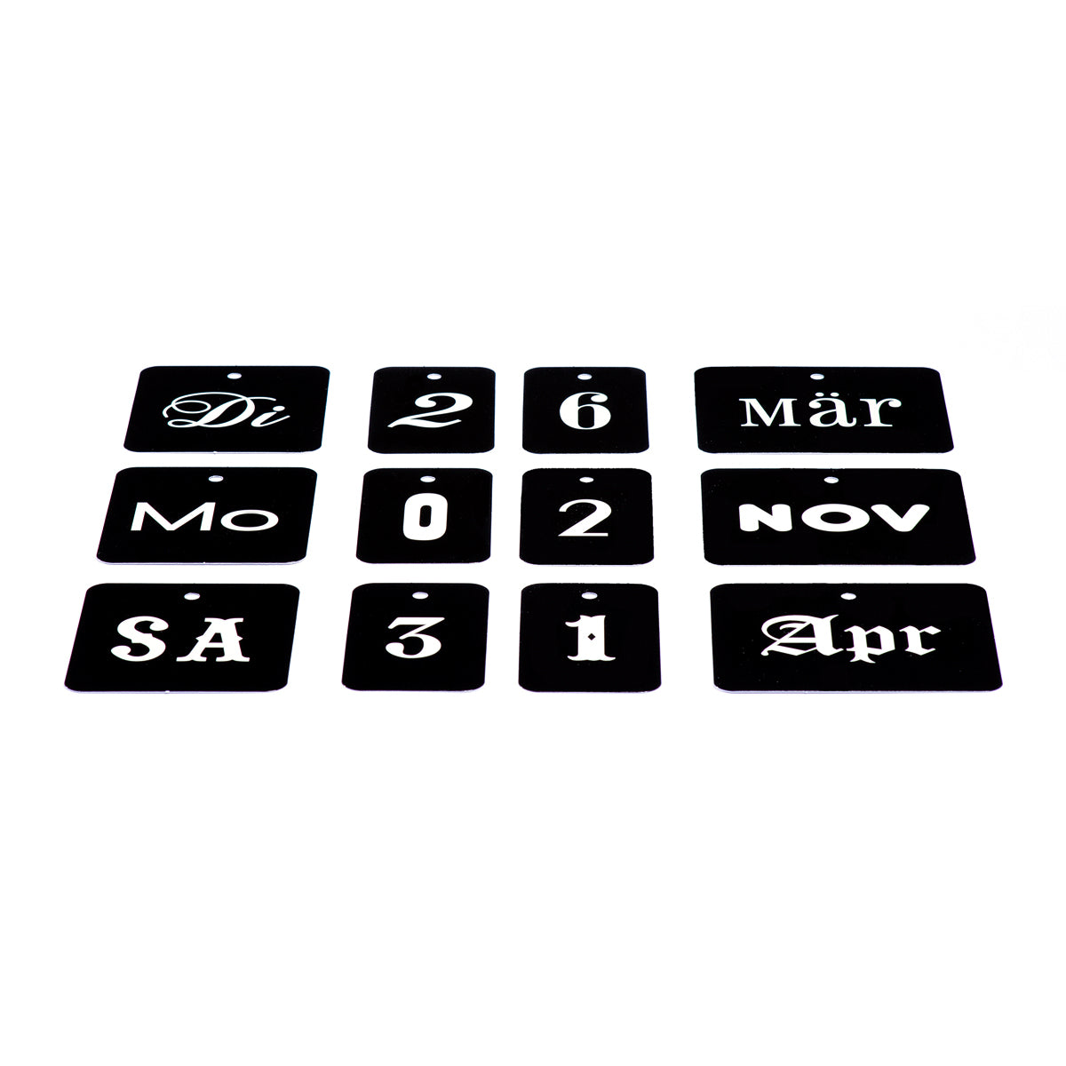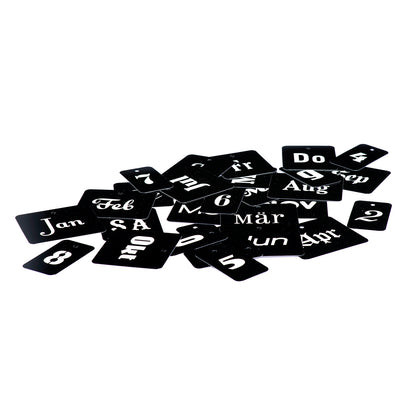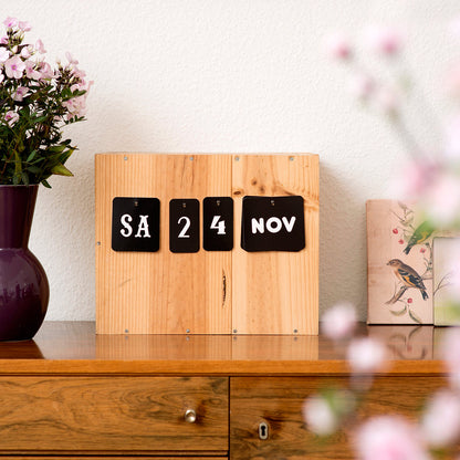 - BONUS: Eine zusätzliche Herz-Karte kann für symbolische Tage den Wochentag ersetzen. So kann man typografisch und herzlich einen Geburtstag, den Hochzeitstag oder einfach den Jahrestag eines schönen Erlebnisses feiern