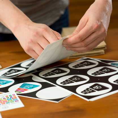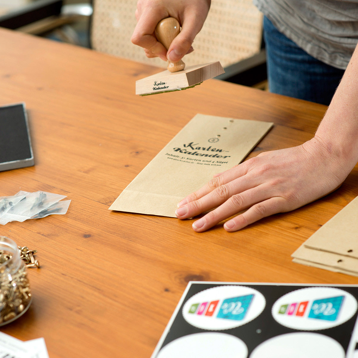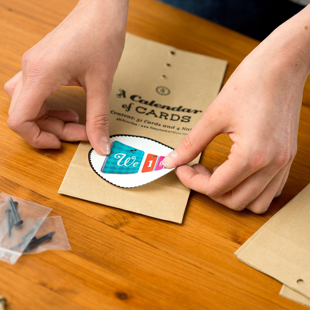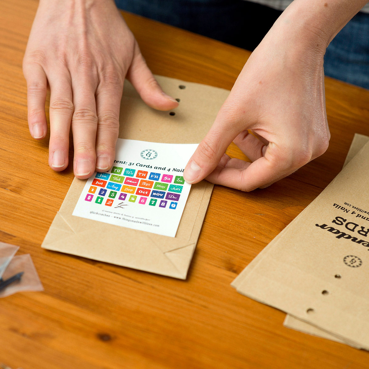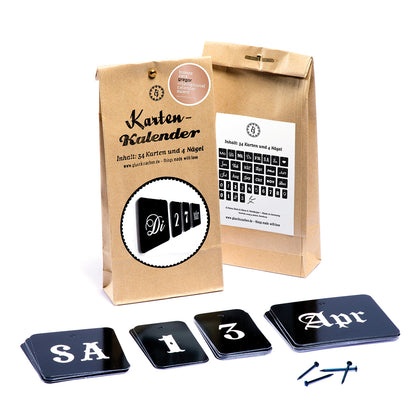 - FAKTEN: 34 Karten/4 Nägel verpackt in einer handbestempelten Papiertüte. Die Kärtchen können in Stapeln (Tag, Datum, Monat) an den Nägeln aufgehängt und jeden Morgen um eine Position weitergerückt werden