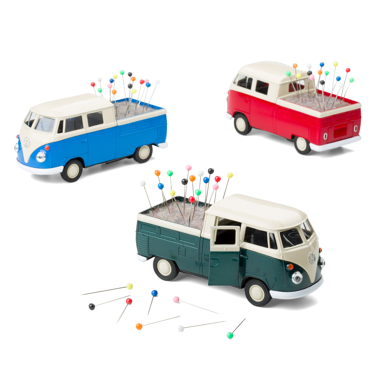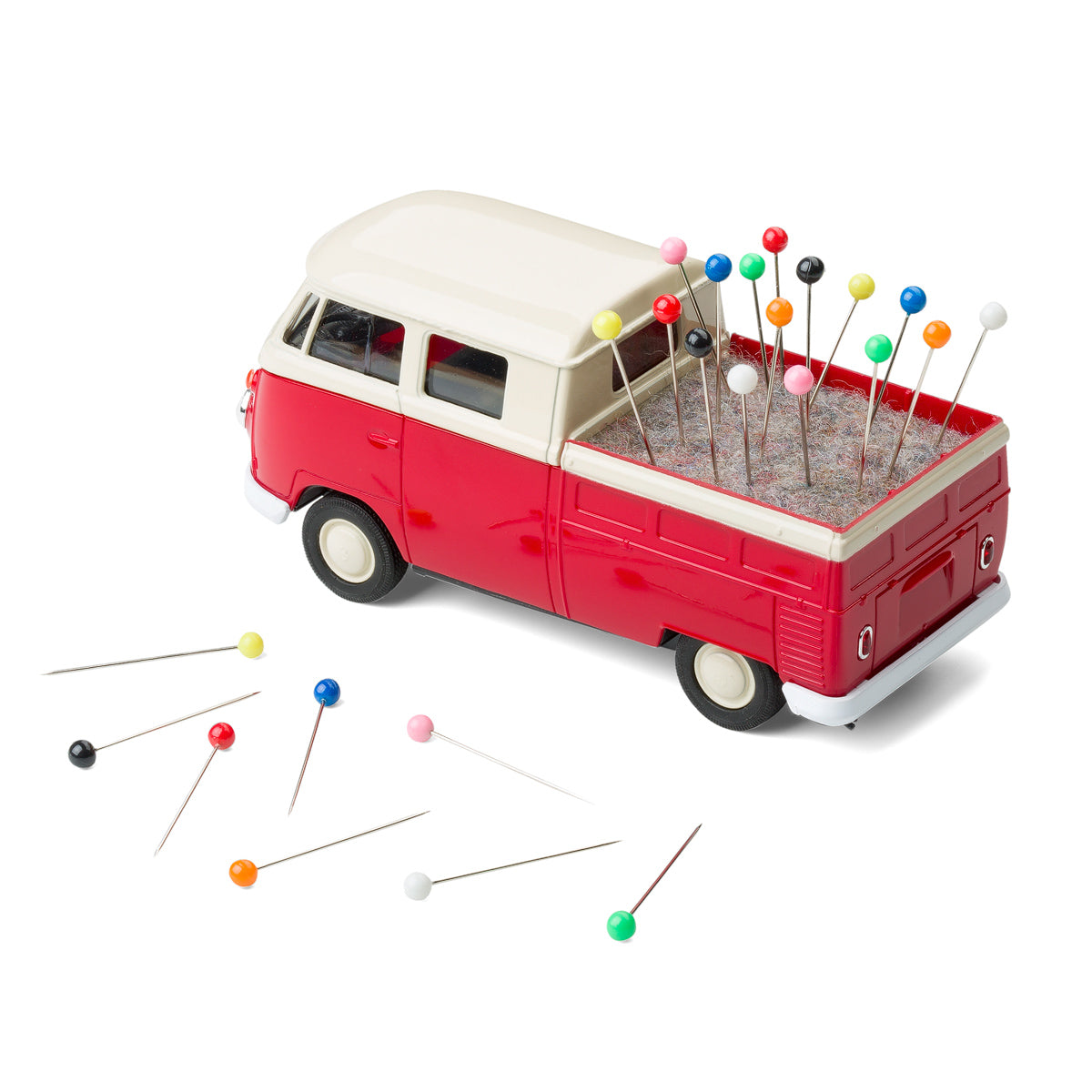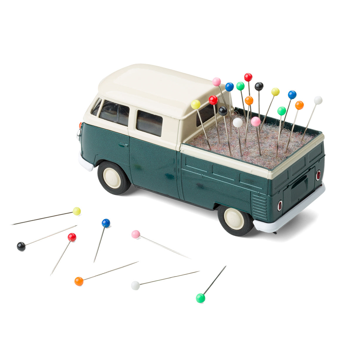 Das rollende Nadelkissen ist eine wirklich schöne Deko und ein echtes Nutzfahrzeug. Schluss mit dem kreativen Chaos. Direkt startklar zum Nähen werden 25 Buntkopf-Stecknadeln mitgeliefert. Die hintere Tür auf der Beifahrerseite lässt sich öffnen.