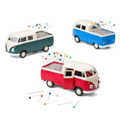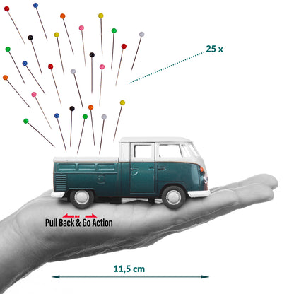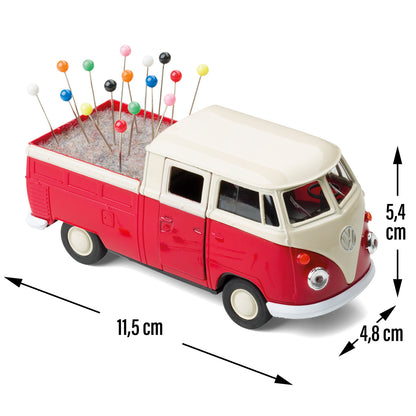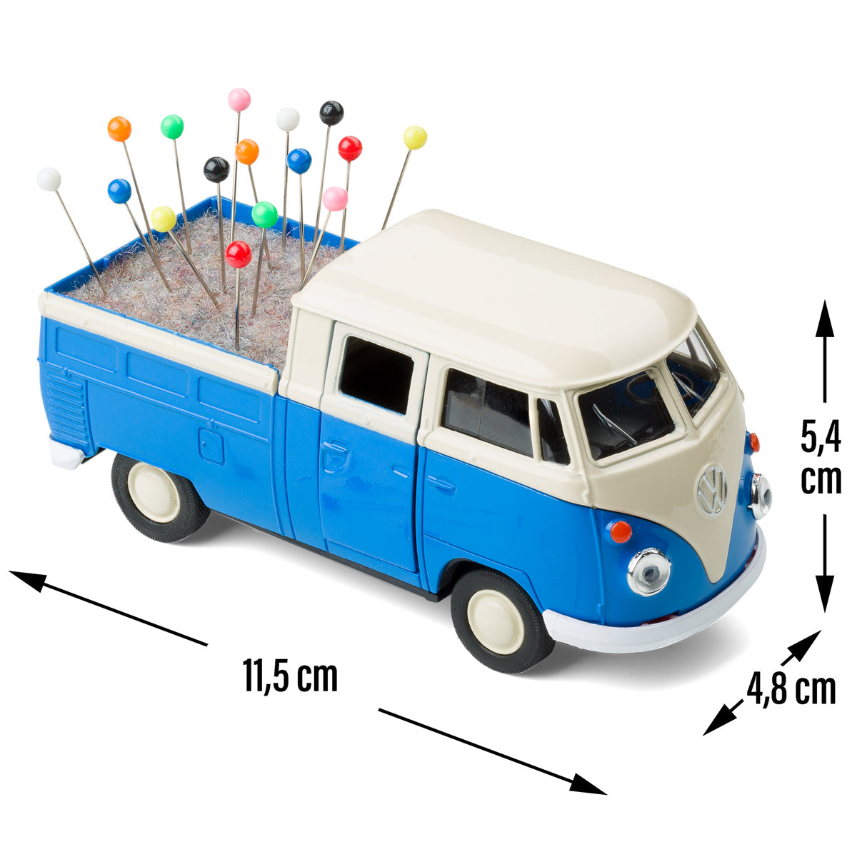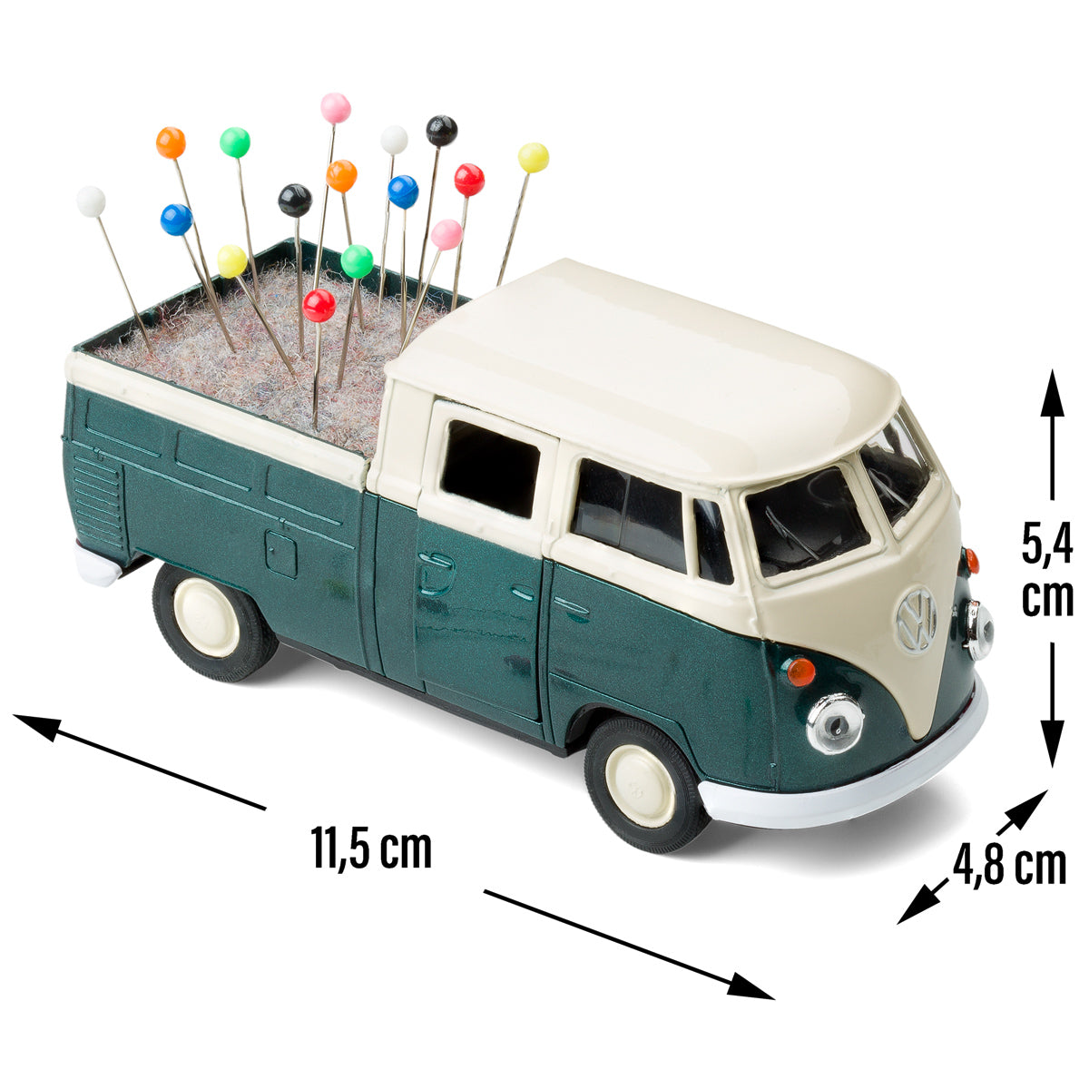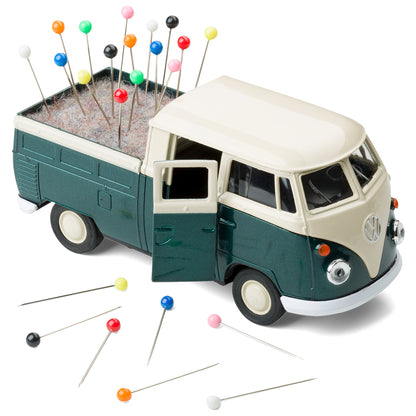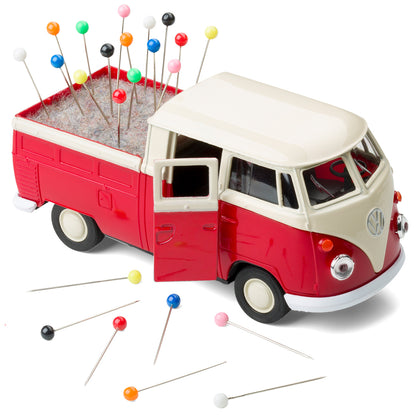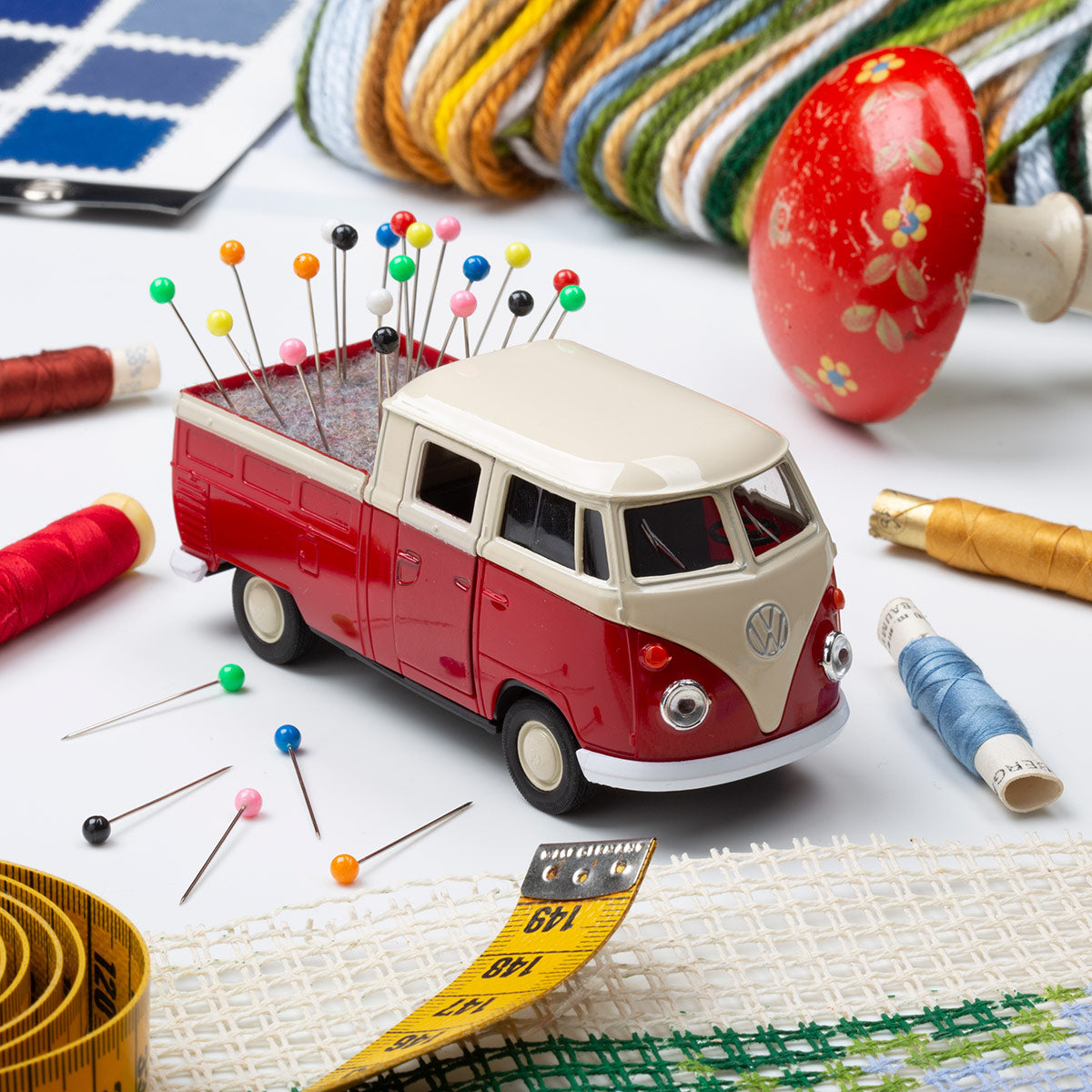 Das rollende Nadelkissen ist eine wirklich schöne Deko und ein echtes Nutzfahrzeug. Schluss mit dem kreativen Chaos. Direkt startklar zum Nähen werden 25 Buntkopf-Stecknadeln mitgeliefert. Die hintere Tür auf der Beifahrerseite lässt sich öffnen.