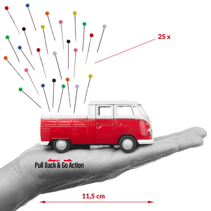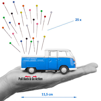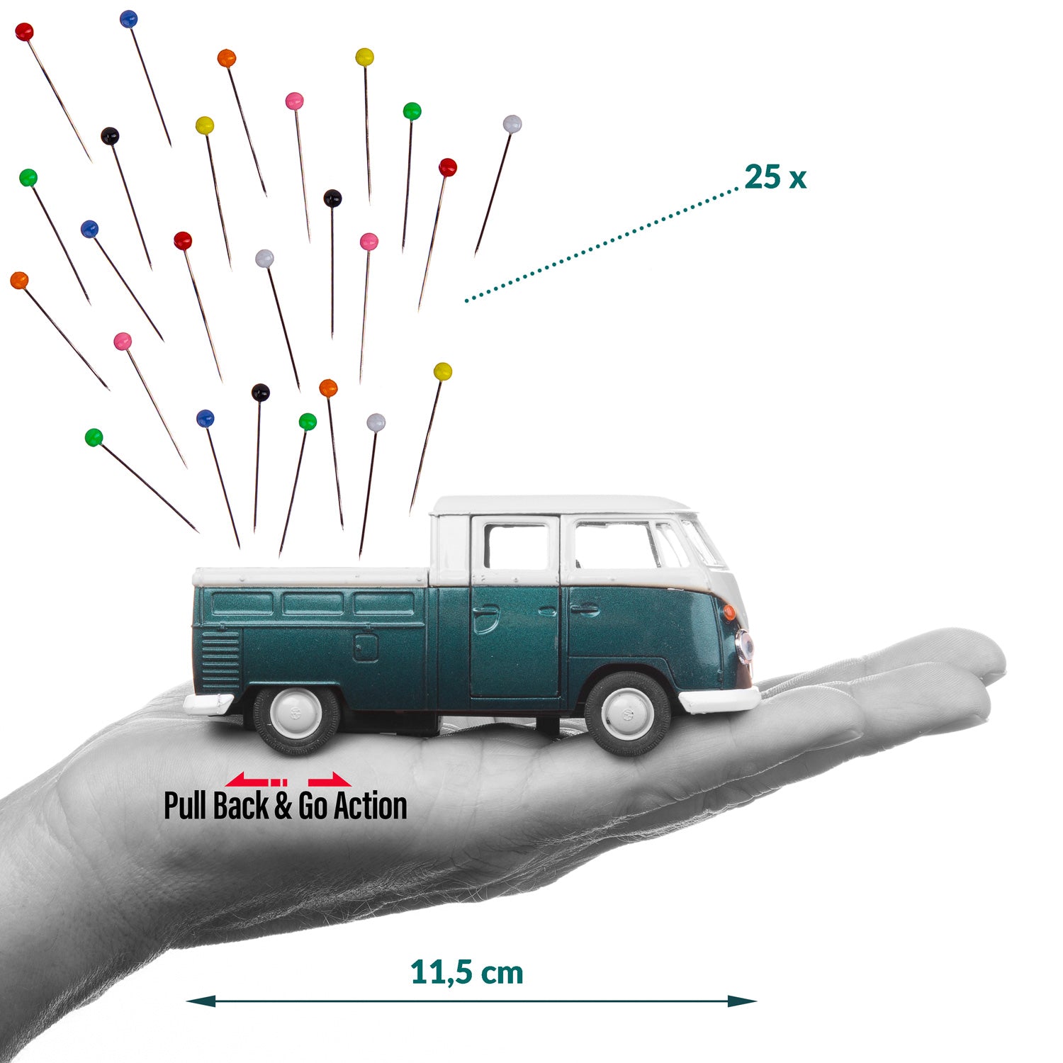 - Modellauto: Metall-Spritzguss mit Kunststoffteilen im Maßstab 1:38 (11,5 cm lang) mit Rückzugmotor, Filzeinlage und inkl. 25 Buntkopf-Stecknadeln
