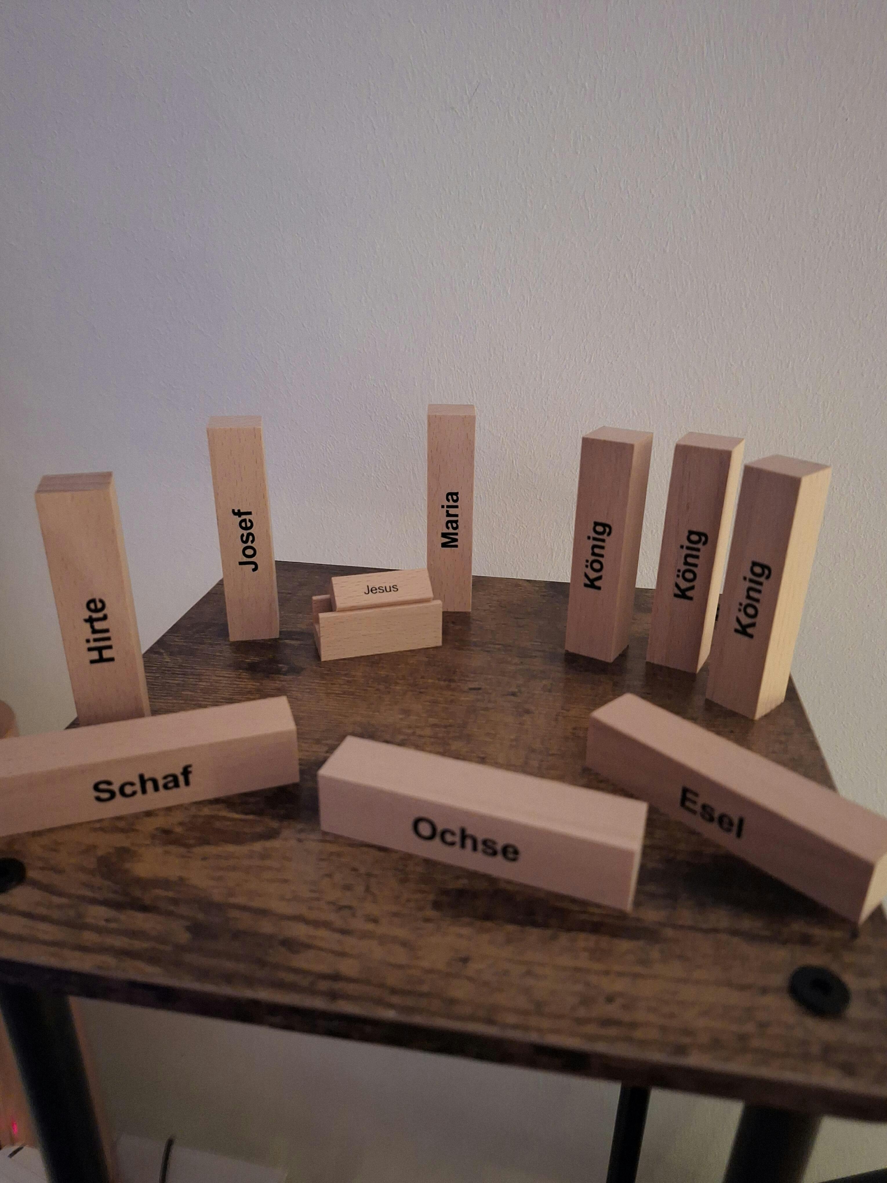Der Berliner Künstler Oliver Fabel findet, dass wir solchen ikonografischen Ballast gar nicht mehr brauchen und hat seine eigene Krippenversion gebaut: schlichte hölzerne Bausteine mit aufgedruckten Bezeichnungen.