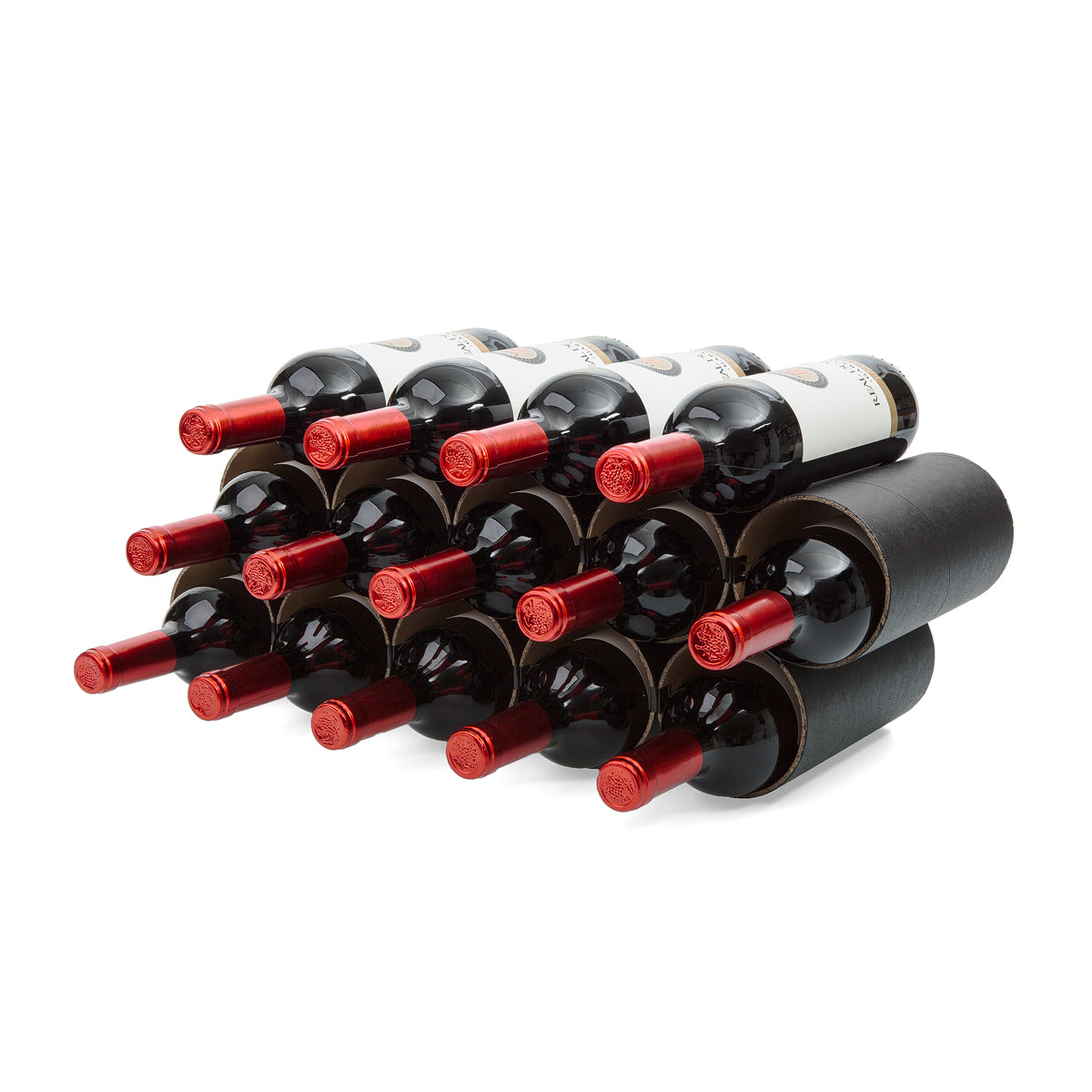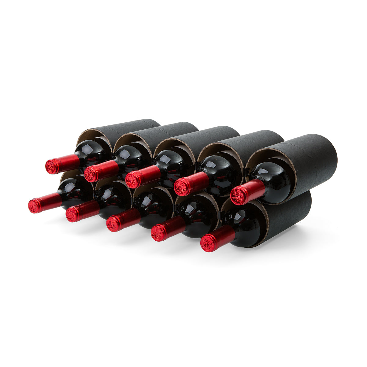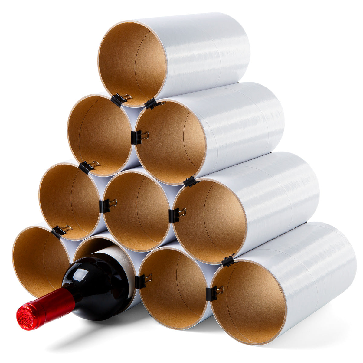 Es gibt eine 10er Version bestehend aus 10 Kartonhülsen sowie 24 schwarzen Architektenklammern. Dieses Weinregal bietet je nach Anordnung der Hülsen Platz für bis zu 19 separat lagernde Flaschen.