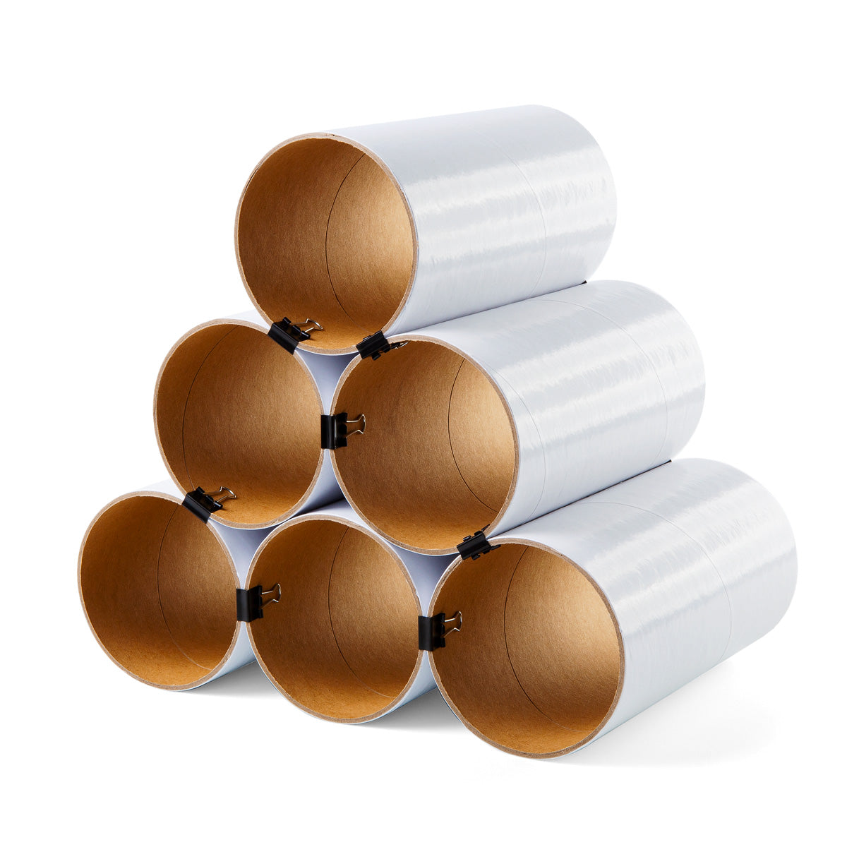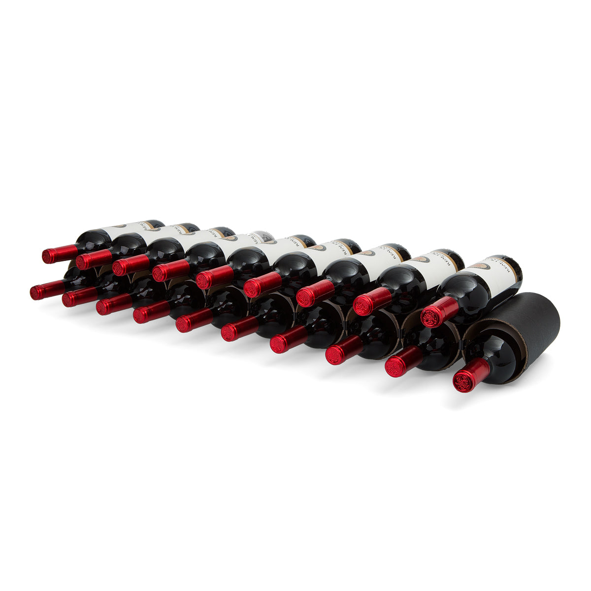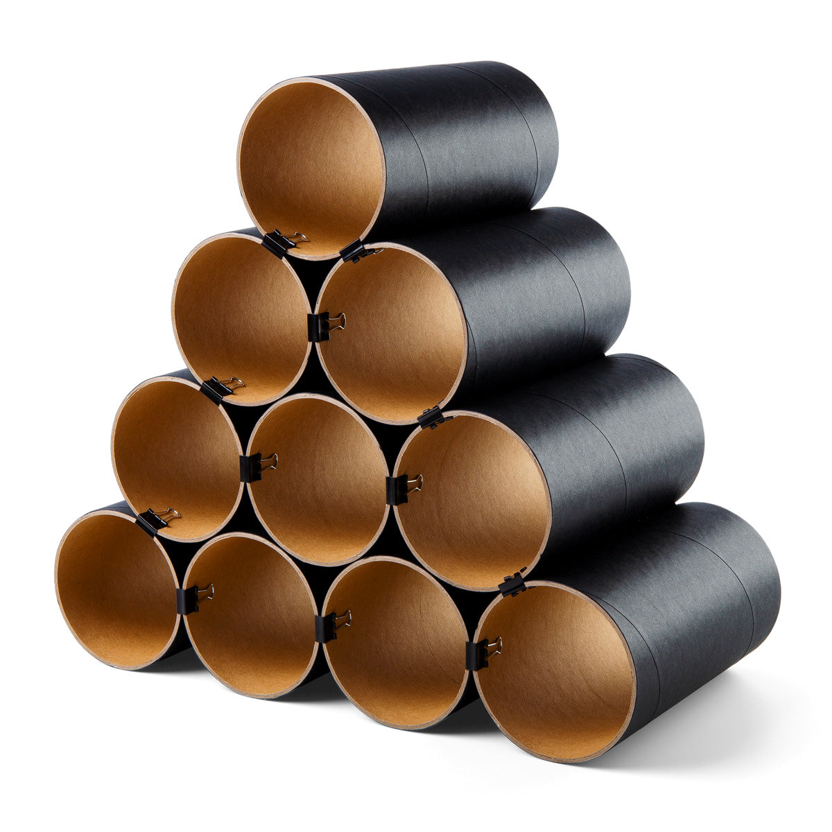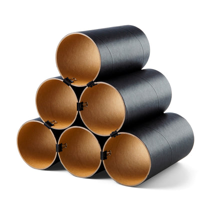Es gibt eine 10er Version bestehend aus 10 Kartonhülsen sowie 24 schwarzen Architektenklammern. Dieses Weinregal bietet je nach Anordnung der Hülsen Platz für bis zu 19 separat lagernde Flaschen.