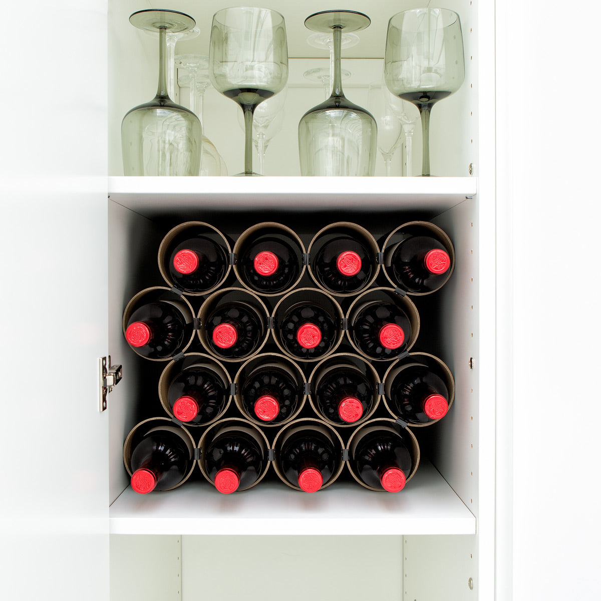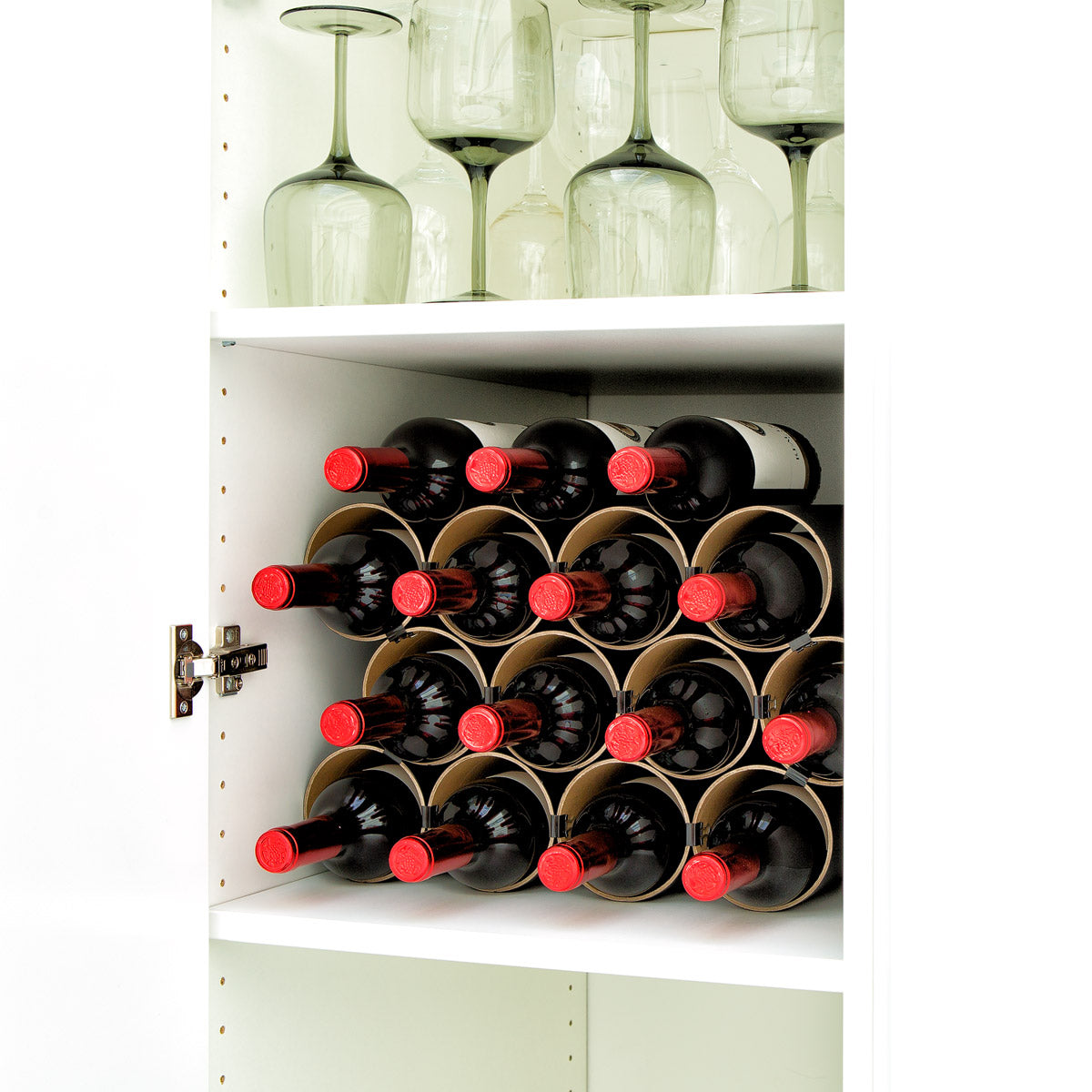 - Zum bequemen Einlagern und Entnehmen lagern die Flaschen einzeln jeweils in einer Röhre sowie bei Bedarf zusätzlich auf dem Regal in den sich ergebenden Mulden