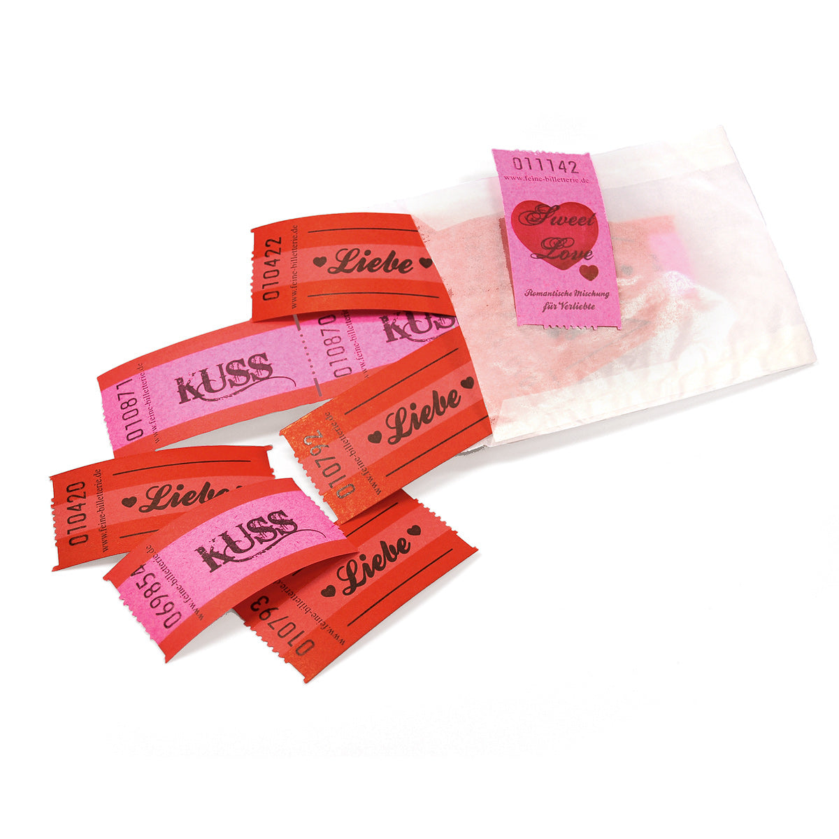 20 Wertmarken im Pergamintütchen (je 10 Stück Liebe und Kuss)